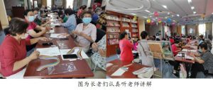 随后,老人们在周老师的带领和指导下开始制作自己的“荷花”作品。在最初时段,热闹的现场不免夹杂着一丝混乱,因为一些老人还无法灵活使用手中的工具,不得不频频向工作人员求助。经过工作人员的耐心指导,大家逐渐变得得心应手起来,并还在自己的作品中增添一些亮点。