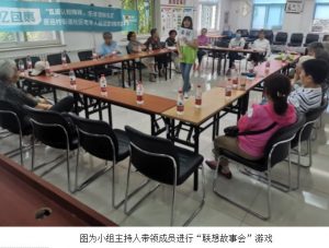 “联想故事会”要求小组成员按照主持人所展示的特定词汇来进行无目的联想,并根据其中任意三个关键词,进行造句和故事创造。王阿姨根据“玫瑰”想到“爱情”,张阿姨根据“鱼”想到“潜艇”,史叔叔更是根据“围巾、饭盒、豆沙包”三个词,创造出来一个全新的“小红帽”故事。就这样,大家根据自己的生活经验和适当联想,创造了很多丰富多彩的故事。
