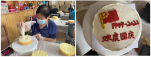 本次活动邀请了专业蛋糕制作老师,为大家详细讲解蛋糕的特性、结构、营养成分等特性。大家仔细倾听,认真揣摩,并跟随老师的指导动手尝试制作。抹奶油、放装饰,每一下都很小心翼翼,还不时地征求老师和其他人的意见,现场洋溢着温馨和甜蜜。伴着浓郁的奶油香气,学员们在蛋糕上绘制了国旗、红星等图案,并用心写下“祖国万岁”,以他们独特的方式向祖国母亲致以最真诚的祝福。