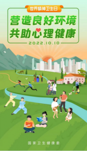 2022年10月10日是第31个 “世界精神卫生日”,它是由世界精神病学协会在1992年发起的。今年宣传主题为“营造良好环境,共助心理健康”,力求通过多种途径的宣传活动,推动全社会提高认识,营造维护和促进心理健康和精神卫生的良好氛围,提供适宜的心理支持和心理健康服务,提升心理健康和精神卫生水平。