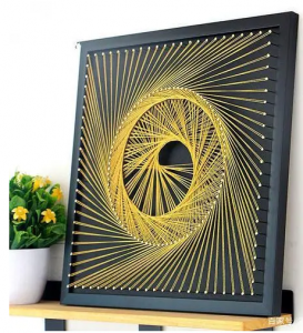 绕线画,又名钉子画、弦丝画,是一门手工艺术,指的是一种由钉子和线牵拉而成的图画。做法是先在木板上根据大概的轮廓钉上钉子,然后用线在钉子之间交互缠绕,组成几何图形或者图画,有一种线性的美。