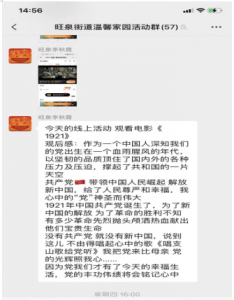 活动伊始,社工向大家说明了此次活动的意义,并介绍了该电影的主要内容。影片聚焦1921年国内外历史事件,重现了百年前波澜壮阔、开天辟地的历史时刻,讲述了陈独秀、李大钊等首批共产党人从民族危亡的困境出发,满怀激情,坚定信念,担起救亡图存的重任,突破各股复杂势力的监控和追踪,历经千难万险终于在上海召开中国共产党第一次全国代表大会。演员们用精湛的演技,完美还原了那一段惊心动魄、充满坎坷与悲壮的历史,上演了一幕幕感人至深的画面,深深感染了观看这部影片的每一个人。