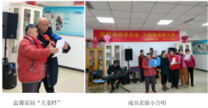 接下来,现场就交给了参与活动的成员们。大家在张老师电子琴的伴奏下,自觉有序地进行表演,从独唱到小合唱再到大合唱,从独舞到歌伴舞再到戏曲,一个接一个,精彩连连。就连温馨家园里唯一的“夫妻档”也将自己准备的节目呈现出来,收获了掌声一片。最后的猜灯谜环节充满了欢笑与乐趣,大家开动脑筋,争相抢着说出答案,虽对错不一,却增添了不少愉悦气氛。