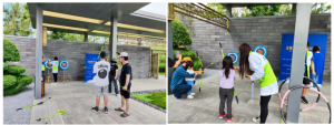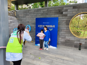 这次调研活动共设置了问卷访谈、传统互动游戏、拍照打卡三大板块。其中问卷部分采取线上线下中英文并行的方式,便于外国友人了解和参与;游戏环节主要有射箭、投壶、抽陀螺、踢毽子等项目。活动开始后,在社区工作者有效组织和引导下,参与人员有序进入现场,并由社工介绍和帮助,就“我的国际范”“如何打造国际范”等相关问题,填写调研问卷,提出自己的看法和观点。一名韩国友人首次参与社区活动,平时对中国文化十分感兴趣,当即表示这就是他想要的国际范,并在打卡墙上留下自己的殷切期望。