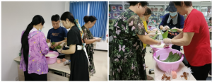 随后,正式进入包粽子环节。学员们纷纷拿出自己的看家本领,折粽叶、填充、封口、扎捆,巧手翻飞间,一个小巧的粽子就成型了。虽说包粽子看似简单,但真做起来不是那么容易,它需要一些技巧,比如填充食材的多少、粽叶如何折叠、困扎的力度等等。手法娴熟的学员及工作人员现场向其他人传授方法和技巧,在相互交流中,一起体验动手的快乐,期待香粽的出炉,感受浓浓的节日气氛。