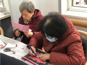 剪纸是我国广为流传的民间艺术形式,一张彩纸、一把剪刀就可以活灵活现地呈现千变万化的自然形态。活动开始后,剪纸老师首先对剪纸的纹样处理、特点把握等技巧进行详细讲解,让社区居民对该门艺术有个初步了解。随后,老师带领大家进行实际操作。居民们怀着极大的兴趣,依照老师的指导,逐渐体会到动手剪纸的乐趣,特别是作品中所蕴含的吉祥寓意给予大家无比的成就感,积极将自己的“杰作”展示出来。另外,一些居民对书画也表现出浓厚的兴趣,纷纷挥毫泼墨,一展身手。