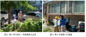 2023年7月11号下午两点半,社工与青少年及其家长在北窑地小区文化长廊亭集合。社工先简要介绍了此次活动的具体内容与安排,包括清理凉亭一带草丛积留的垃圾和社区墙面的废弃通知及小广告等。随后,物管会成员向青少年发放垃圾夹、垃圾袋等卫生工具以及饮用水、冰凉贴等防暑物品,并再三叮嘱大家要注意卫生安全与防暑。烈日炎炎下,青少年们似乎忘记了灼热的阳光,而是一次次俯下身认真地清理草丛,捡拾垃圾,他们欢跃的身影成为初伏天里一道亮丽的风景线。在凉亭补水擦汗稍作休息后,青少年在家长们的带领下前往各自负责的区域进行小广告清理。经过大家的共同努力,草丛整洁了,焕发出活力;墙面干净了,映照出大家的笑脸。