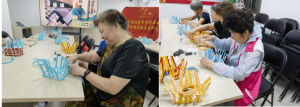 工作人员先给成员们派发了需要用到的工具,随后由专业的编织老师讲解藤编的技法和款式。在此之前,很多成员只听说过“手工藤编”,但没真正接触过。在老师带领下,成员们从最基础的编织手法开始,用彩色纸藤编织篮底、篮筐,最后编织篮顶。整个过程中,老师逐一指导大家的编织手法,哪里编的松了、紧了,边角如何处理等等;成员们虚心请教,精心编织,力求做的更完美。