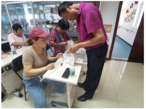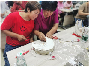 一开始,社工先向大家介绍了本次活动的主题、中秋节的由来及其风俗习惯,再由志愿者为大家发放灯笼的材料包。随后在社工带领下,学员们纷纷打开材料包,制作起来。大家利用胶水将花纸、框架进行粘贴,组装成型。不一会儿,一个个闪动着温馨光芒的灯笼相继出现在大家的面前。趁着学员们快乐欢愉的心情,社工为大家送上了象征团圆美好的中秋礼物——月饼。