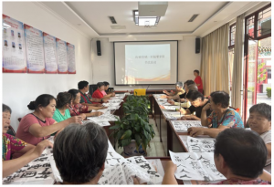 对于学员们而言,书法这种高雅的艺术似乎不属于她们的生活范围,也许手工制作、参加知识培训、户外健步走等是她们的专长。后来在书法老师的鼓励下,大家信心倍增。握毛笔的手不再发抖,落笔也不再犹豫,一笔一划虽略带拘谨,却工整干净。书写完毕后,老师逐一指导点评,给予大家认可和鼓舞。