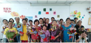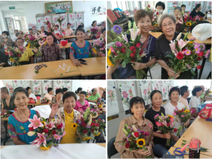 鲜花寄情。成员们在体验包花束乐趣的同时,主要借鲜花传达对温馨家园老师的感恩之情,亦抒心底的家国情怀。