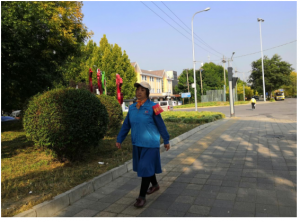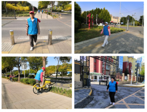 园长赵和平身先士卒,带领王美英、邵希庆、李敏、孙凤荣等志愿者奔走在康营家园二社区的执勤岗位上。他们在社区的安全点位周围认真巡逻,时刻保持警惕,严密注意街上是否有不安全因素;看到乱停的共享单车时,他们立刻上前码放整齐。