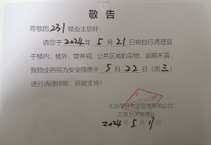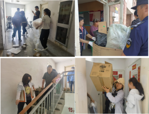 为有效解决堆物堆料问题,从3月底开始,社区联动物业采用“自清+帮清”方式,并于4月中旬开展楼内僵尸车清理活动(共兑换僵尸车10辆)。5月上旬,社区、物业通过在社区微信群发送通知、在单元门口张贴书面通知等方式,告知居民及时清理杂物,妥善保管个人物品。
