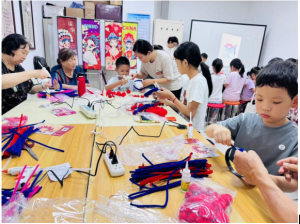 随后在老师指导下,孩子们认真制作头饰。他们巧妙地对头箍、多彩扭扭棒、大小毛球等材料进行改造和创新,将传统文化和流行元素进行融合。经过两个多小时的精心制作,一个个精致而又独特的京剧发箍终于成型了。孩子们迫不及待地将发箍戴在头上,让工作人员帮忙拍照,留存这一美好瞬间。