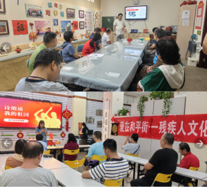 本场活动分为三个部分,分别是“学习中国人民抗日战争纪念日知识、唱响红歌强国有我、诗朗诵《我的祖国》。”在纪念日学习部分,志愿者老师从节日介绍、抗日重大战役、节日的由来及意义和中国抗战人物四个部分进行讲解,帮助大家了解抗战历史,传承红色基因。有了知识的加持,残疾朋友们怀着一腔爱国热情,合唱了《义勇军进行曲》、《歌唱祖国》、《没有共产党就没有新中国》、《红星照我去战斗》等爱国歌曲,在歌声中重温历史,于现实中砥砺前行。最后是来自和平家园的小赵为大家朗诵现代诗《我的祖国》。“你是威风凛凛的雄狮,舞动神州的雄风。你是人类智慧的起源,点燃文明的星火。你有一个神圣的名字,那就是中国!”随着铿锵有力的朗诵声落地,此次活动也画上了圆满的句号。