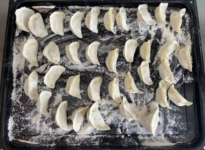 活动现场,社工和志愿者早早准备好了新鲜的食材:翠绿的芹菜、香喷喷的猪肉,还有雪白的面粉。残疾朋友们陆续到来后,在社工和志愿者带领下分工进行。一些人择芹菜、清洗、剁碎,然后与肉馅、耗油、盐、十三香等材料搅拌成饺子馅,一些人和面、抻成长条、擀饺子皮。等工序准备完毕后,就开始了今天的重头戏——包饺子。