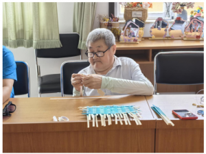 当天,立德社工和家园工作人员提前为参与学员摆放好活动材料;随后专业老师向大家详细介绍竹编扇的历史渊源、文化意义及制作流程,使得大家对这项传统技艺愈发感兴趣。在接下来的制作环节,学员们在老师耐心指导下,小心翼翼地拿起竹条,按照 “挑一压一” 的方法,专注地编织起来。虽然过程中会遇到一些困难,如竹条易断、编织不整齐等,但在周围人的鼓励与帮助下,学员们也都逐渐掌握了技巧。