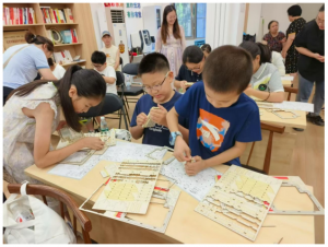 活动最热闹的当属“化身小工匠”动手环节。在老师指导下,孩子们兴致勃勃地拼插“斗拱”、组合“梁柱”,在搭建简易古建模型过程中,抽象的原理转化为指尖的触感与成型的喜悦。现场专注的孩子们与热情协助的家长们,共同营造出浓厚的学习实践氛围。