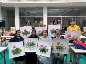 今天绘画的主题是荷花。牛老师先将样品展示在白板上,然后从花瓣、荷叶到根茎、脉络,由浅至深地为大家讲解整片荷花的绘画步骤。学员们拿起画笔,跟着牛老师的讲解一步步将这美景临摹出来。“老师您快看看我这荷花,怎么这么瘪啊?”一位阿姨的疑问道出了全员的心声。社工协助牛老师一块分析学员们的作品,找到问题所在,并手把手地带大家改变下笔的方向、力度和走向;学员们也自动分成小组,互相分析作品的不足,为对方提出改进建议。一番探讨之后,学员们又专心打磨起自己的作品,笔下的荷花也逐渐变得丰盈饱满起来。带着满心的欢喜和成就感,学员们手持着作品与牛老师合影留念,为这最后一次国画课画上圆满的句号。