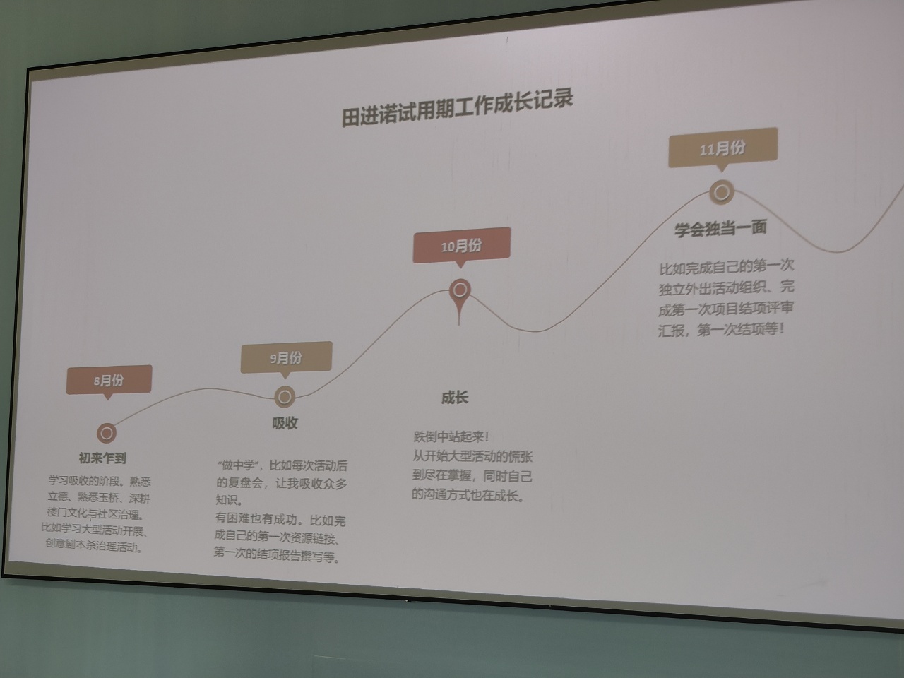 转正是新人在立德团队工作必经的流程,是对新人成长的检验,也是新人与单位领导互动,对标机构人才要求的机会。11月25日上午,副中心团队的项目主管田进诺、残障团队顺义一部项目社工冯海洋分别根据制度要求进行了转正汇报。