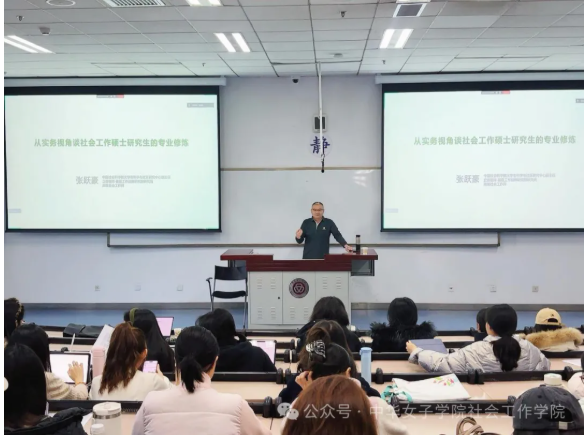 2025年11月18日下午,由中华女子学院社会工作学院与科研处联合主办的“‘育慧大讲堂’第十九期暨社会工作学院‘智行讲堂’第二十七讲”在教图楼210教室举行。本讲特邀立德智库˙基层工作品牌研究院研究员、高级社会工作师张跃豪老师作专题报告,主题为《从实务视角谈社会工作硕士研究生的专业修炼》。讲座由社会工作学院副院长郝彩虹副教授主持,2025级全体社会工作硕士研究生和部分导师参加。