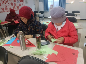为丰富残疾人精神文化生活,12月30日,高丽营镇温馨家园经润禾社工组织开展了剪纸主题活动。活动现场,志愿者耐心讲解“五星爱心”剪纸技巧,手把手指导残疾学员勾勒线条、裁剪造型等。学员们用心创作,于巧手翻飞间将一张张红纸裁剪成一颗颗五星相衔接的精致图案。这一幅幅作品见证了家园对学员们真切的关怀,也映照出大家朴素的爱国主义情怀。