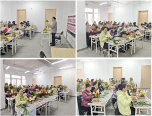 在接下来的实操环节中,女性居民化身“花艺设计师”,遵循老师指导并融入自我创意,精心修剪搭配。伴随着阵阵欢声笑语,一个个独具匠心的花束竞相开放,散发出缕缕清香,令人沉醉。望着这一束束娇艳的花朵,若不来个合影,岂不浪费了这番美景?笑脸与花朵相互映衬,画面是如此的和谐动人。