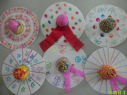 当我把提前做好的草帽拿给他们看时,有的说是:“光盘做的”,还有的说:“不知道是什么做的,觉得蛮漂亮的”。随后,我又出示了皱纹纸、果冻碗、白纸剪好的圆圈等,用来做帽沿,他们看到后笑了。