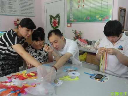 在一片欢笑声中,大家纷纷完成了作品,他们拿着自己的作品都非常高兴。因为这是他们的作品,是他们自己动手编制的劳动成果。看着大家快乐的笑容,我也收获到一种开心和幸福。关爱残障人士,创享至善生活,我们携手同行!