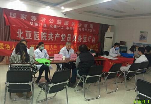 2014年12月18日上午,立德社工在华严北里西社区为社区老年人开展健康服务活动。为了更好地服务于社区老年人,针对老年人有计划地开展健康教育、疾病预防和保健等医疗护理活动,我机构特邀北京北亚医院专家医生、华德眼科专家为老年人提供免费健康咨询与检测服务。