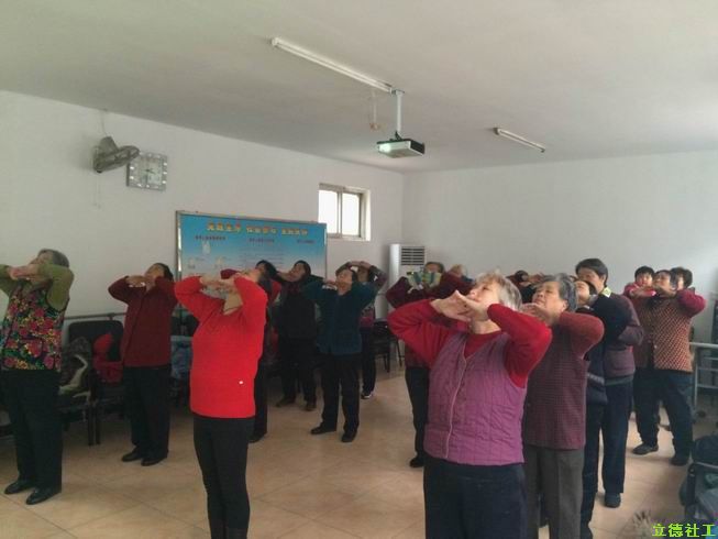 在成功的开展了手指操和拍打操之后,我们的伸展操也提上了我们活动的日程。并且,在我们活动准备的时候,桃园社区专门准备了以前老居委会的活动室供我们使用,将其作为我们老年人活动的专门的场地。在社工开展活动前,我们带领着老年人丰富了有关伸展的知识,并最终确定以伸展操为开始来开展养生课堂的第二阶段活动。由于手指操和伸展操的开展得到了社区叔叔阿姨和社区工作人员的支持与认可,使得下午两点的活动准时开始。首先我们先介绍了第三阶段的养生课堂内容,并希望前期参与活动的叔叔阿姨能够继续参加沈赞操。然后正式开始为大家教授伸展操,叔叔阿姨们都特别配合我们的活动,并且学习的十分认真。虽然由于老年人的各项身体机能退化,所以很多伸展的动作都不能够做到位和准确,但都很认真听讲并且勤于练习。各位老年人跟着社工数着节拍一遍一遍的学,并且在休息时大家相互之间讨论动作,相互监督着熟悉动作及顺序。在今天和上周的活动中,我们教了老年人伸展操的前八节,在教的过程中穿插一些关于身体伸展的一些知识和注意事项,让老年人能够有目标的学习。最后我们复习完今天所学的前八节并约定本下周的伸展操活动,在欢乐和和谐的氛围当中结束了我们的这次活动。
