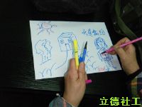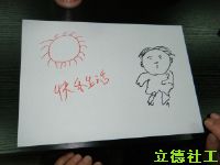 随后曹老师又让大家用绘画表现出自己快乐的心情,大家纷纷拿起彩笔,有画笑脸的,有画翩翩起舞的小人的,有画小动物的,大家一边画一边分享自己着自己生活中快乐的事情,一位叔叔向我们介绍自己的绘画,叔叔生动形象地展现出了初春暖洋洋的太阳照耀在一片绿色的草地上,草地旁边还有几棵绿树正在生机勃勃地成长。叔叔告诉我们之所以画这样一幅画,是因为他在做交通疏导的时候,感受到早上八九点的阳光照耀在自己的脸上,特别舒服和温暖,并且叔叔还告诉我们,阳光照射在眼睛上,可以缓解自己眼睛的疲劳。