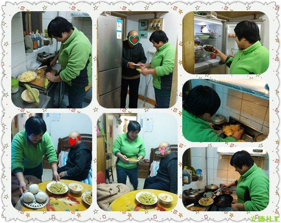 看到我们一直忙碌,叔叔很感动,一个劲说“谢谢你们”,并一再让我们留下吃饭并坚持给菜钱。我们也有自己的职业操守,社工不能随便接受案主东西,何况这是我们该做且力所能及的事。让叔叔慢慢享用,并跟叔叔约好,下次有时间一块儿给叔叔包水饺吃;叔叔还告诉我们说特别想出去晒晒太阳,我们说“没问题”,虽然轮椅搬起来特别沉,但我们会挑选一个温暖的午后,带搀扶叔叔下楼,到小区公园里一起晒太阳、话家长。