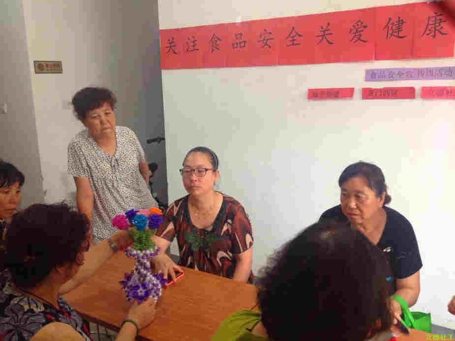 提醒居民,谨防路边无证小贩及三无产品这类存在安全隐患的食物,尽量去正规途径购买.夏季天气炎热,留意食物保质期,开封后食品应及时冷藏并及时食用.如因食品引发不适,及时就医察看.活动由手工班成员及立德社工共同参与,活动中社工与居民互动,一同讨论分享与食品安全有关的小故事,大家热情参与其中.活动不仅让大家增长知识,还增进成员间感情交流,让班级更融洽.