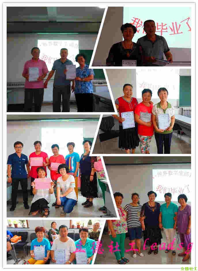照片放完后,由沧顺路社区居委会丛主任给大家颁发结业证书,立德社会工作服务中心王主任给志愿者颁发优秀党员志愿者证书,最后大家合影。