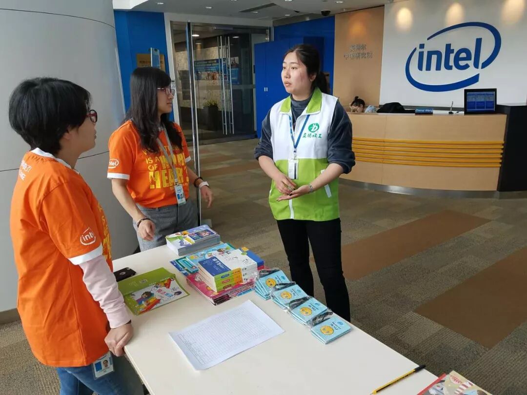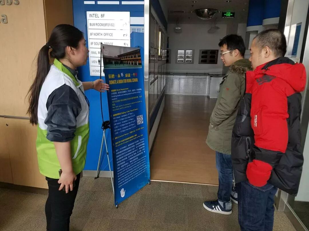 时值中午,英特尔移动通讯技术(北京)有限公司、英特尔研究院、英特尔(中国)有限公司的志愿者联合立德社工在各自的办公场所,立展架、摆桌子、做介绍,开展为玉斗小学捐献图书,助建乡村图书馆公益活动的宣传推广,部分提前知晓本次活动的英特尔员工已经捐出几本到十几本教辅和课外读物。现场知道这次活动的员工纷纷表示会回家取书参与本次活动。