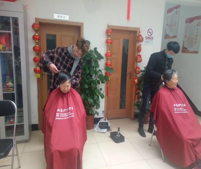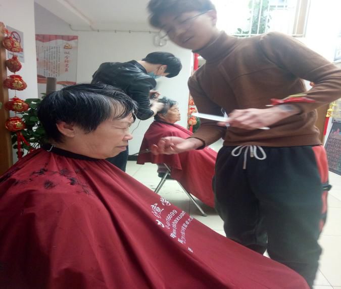 上午9点半不到,已经有需要理发的三四位残障人士在居委会等待。虽然还未出正月,还是希望自己有一个美美哒发型,新年新气象,从头开始。吴阿姨一边和理发师讨论发型,一边请社工通过手机前置摄像头及时观看自己的造型。楼上的正在测量血压的阿姨看到,招呼吴阿姨道:“快来测一下血糖血压,刚测完血糖有点高了。”测完血压后到理发区域问理发师:“我可以理发么?”社工立即邀请阿姨坐下,请理发师为阿姨修理头发毛茬、两边鬓角以及刘海儿。而一旁的吴阿姨还热心的提供意见,理发师心理神会为贾阿姨修剪了一个潮流的空气刘海儿。