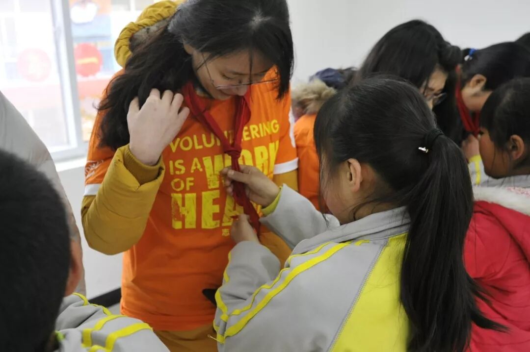 在图书室授牌仪式上,Intel志愿者代表任春明把“Intel立德图书室”标牌交到玉斗小学校长赵平礼手中。赵校长代表校方向冒雪而来的Intel志愿者和立德社工表达感谢。他说:“希望今后有更多的爱心人士走访乡村小学,关心乡村教育,为乡村教育出力。教育强则少年强。”揭牌仪式后,玉斗小学四年级学生为爱心人士佩戴了红领巾。
