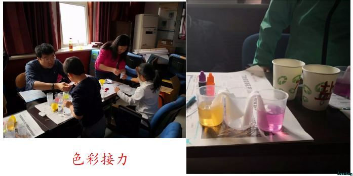 当认识完所有的工具材料后,第一个小实验就开始了!第一个实验是“色彩接力”。“取两个量杯,并往里分别加40ml的水,再任意挑选两个色素,分别往清水里滴入3滴色素,用搅拌棒搅拌均匀……”老师一边说着一边给大家演示着。“老师,我放什么颜色的色素啊?”开始做实验的兴奋让孩子们变得小心翼翼。“什么都可以,任意选两个你最喜欢的颜色”。“两个量杯的中间放一个空杯子,然后将两节卫生纸撕开,这样对折两次,把两端分别放在两个量杯中,等所有实验做完我们再来观察它发生了什么变化?”“老师,会有什么变化啊?”孩子一脸期待的说道。