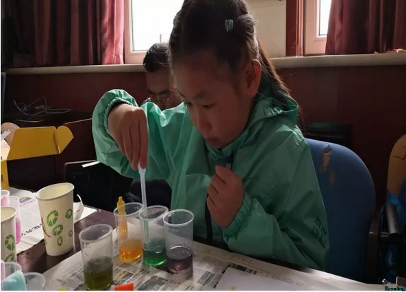大家还沉浸在自己的想象中时,第二个实验“调色大师”也开始了!大家同样是按照社工的讲解步骤一步步将红黄蓝三种颜色交叉调色,当看到自己调出来的橙、绿、紫色后都跃跃欲试调其他颜色。“老师老师你快看,我调出来了草绿色、翠绿色、墨绿色!”一个小男生激动地站起来拿起量杯给社工看。颜色的多变点燃了大家的兴趣,孩子们将调的颜色纷纷记录下来,并且试图调出更多的颜色与旁边的朋友一争高下!“大家知道这有什么原理吗?”社工一个问题将大家的关注点收了回来。“老师我知道。”“我也知道。”“红黄蓝是颜色的三原色,其他所有颜色都可以由这三种颜色调出来,但是任何颜色都调不出三原色!”一个小男生站起来自信地说着。