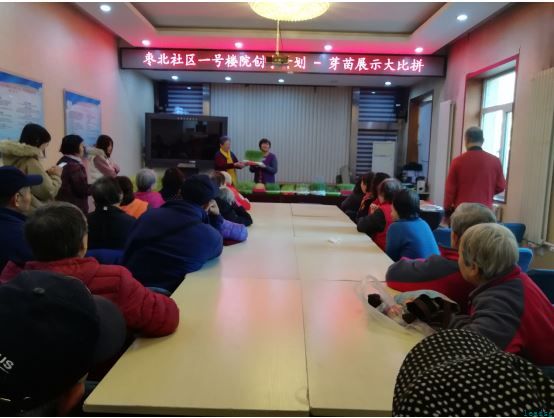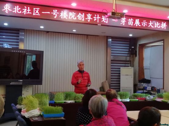 2018年11月20日,枣北社区一号楼院创享计划——芽苗大比拼活动,在枣北社区居委会活动室开始啦!在社区书记和主任的带领下,叔叔阿姨们拿着自己的劳动成果,讲述自己的种植经验,大家互相学习和鼓励,这里变成了一个芽苗种植经验交流的大课堂了!