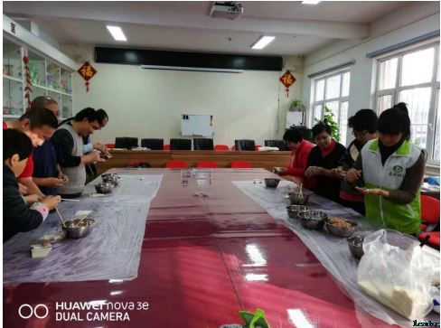 但在活动中,也遇到了点小麻烦,由于老人比较多,和面的吃力活应付不下来,社区樊书记闻讯,马上过来支援现场,帮着和面、擀皮。参与的人越来越多,活动场地略显狭小,小区物业主动腾出会议室,开辟了“分会场”。