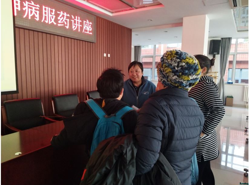 精防医生郑医生首先和大家讨论常见的精神类药物、药物的作用以及服药后的一些反应,并建议大家在服药后定期检查身体,了解自己的身体健康状况;多和医生进行沟通,尤其是在病情出现变化时,医生便于对药物做出调整。郑大夫强调,患者本人看医生拿药是非常必要的,医生能够及时清楚地了解患者本人的状况。郑医生提醒家属,要做好服药时的监护;并要大家牢记:一定要在医生指导下,按医嘱服用药物。
