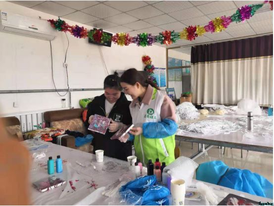 “我的颜色太单调了,我再添两种颜料”“我的颜色太暗沉了,我再加一点亮色”……经过不断调整,每个人都做出了相对满意的作品。“我的像五花肉……”“我的像火山爆发,周围是黑色的,中间红色的像火山喷发出来一样。”学员们还给自己的画作取了名字,如“花树银花”、“星空”等等。