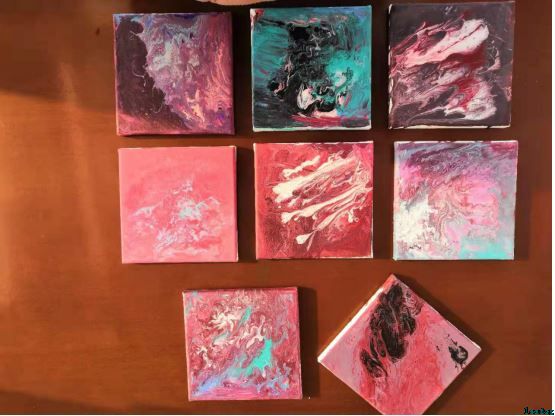 首先选择几种不同颜色的丙烯混合在一个杯子里(不要搅拌它),然后将颜料沿着杯壁倒在画布上,转动方向,使之均匀地分布在画布上,伴随吹气等动作,颜料会有流动,这样不同颜色之间的分界线过度很自然。