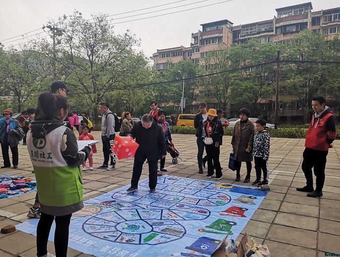 除了闲置物品置换外,现场还设置了“垃圾分类大棋盘”趣味活动。居民对日常可见的废弃物进行辨识,倡导垃圾分类观念。