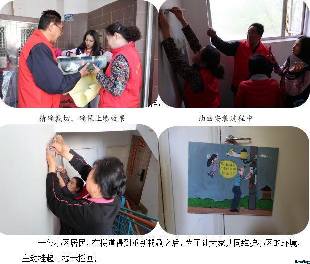 1、李叔带领一组队员到美然动力社区A3区的3个单元安装油画,大家分工明确,有的负责画作裁切入框,有的负责固定位置、安装;社区服务站站长蔡宇,主动担当起较为危险的“高处作业”,为其点赞!