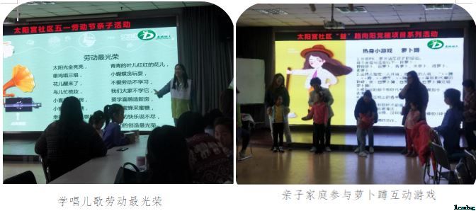 亲子活动人心暖,交流互动情意浓。小朋友和家长互动游戏“萝卜蹲”,活跃了现场气氛;劳动最光荣和五一劳动节知识科普的环节各个家庭也各显神通,有会唱的小朋友参与了合唱,有小学霸参与了劳动节知识问答。孩子们在与家长的共同努力下,出色的完成了一个个有趣的互动活动,家长们也充分体验到了亲子活动所带来的温馨与快乐。