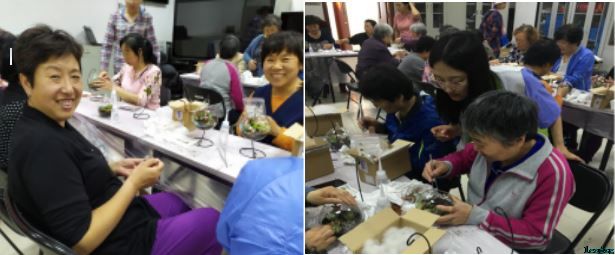活动过程中叔叔阿姨们小心翼翼地给自己的多肉盆景添土、浇水、摆放小物件,设计具有自己特色的工艺品,工作人员在一旁看着也是乐开了花。大家相互协助,彼此分享种植技巧,制作的成品引得众人赞不绝口。
