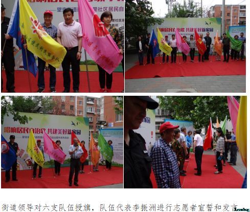 活动现场,街道工委书记胡建东,副书记张立云,街道办事处副主任周向上、王溦,街道办事处民政科科长李杰,劳动科科长苏楠分别对社区新成立的社区环保队、文明引导队、矛盾调解队、党员先锋队、便民利民队、梦秀保卫队进行了授旗。队伍代表李振洲带领大家进行了志愿者宣誓,标志着6支社区志愿者队伍正式成立。今后将围绕社区建设开展社区自治类服务,壮大社区居民自治力量。
